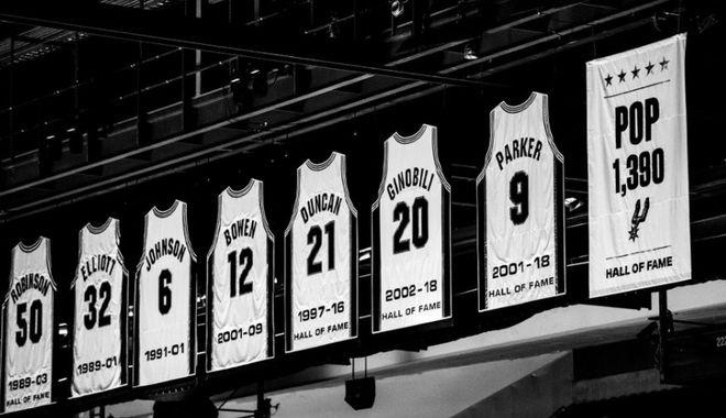 这面纪念旗帜与大卫-罗宾逊的50号、肖恩-埃利奥特的32号、埃弗里-约翰逊的6号、布鲁斯-鲍文的12号、蒂姆-邓肯的21号、马努-吉诺比利的20号以及托尼-帕克的9号退役球衣一同悬挂在球馆上空。