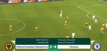 第41分钟,狼队后卫费尔·洛佩斯“送礼”,埃斯特旺挑射为切尔西再进一球,半场结束,切尔西以3比0狼队。